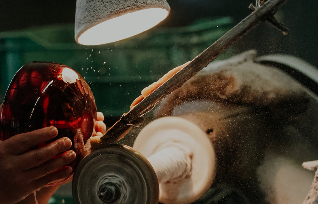 Każdy kieliszek przechodzi przez ręce naszych rzemieślników. Szlifowanie, barwienie, grawerowanie — bez masówki, bez kompromisów.